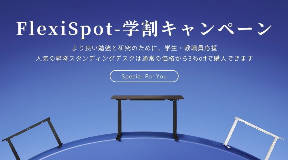 Flexispotの学割キャンペーンでは、昇降デスクの中からお好きなものをお選びいただけます。学生・教職員限定の3%割引を利用して、作業場を劇的に改革し、学校でのパフォーマンスを向上させましょう。