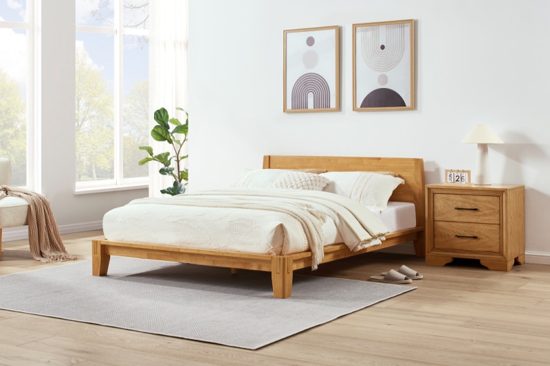 魅力の核心は、やはり「木組み」そのものにあります。パズルのように加工された各パーツが、金属金具に頼ることなく結合。脚部をわずかに内側へ配置することで床面が広く見え、寝室全体にすっきりとした印象をもたらします。補強された横桟は荷重をしっかり支え、丸みのある太脚が床に安定して接地。十分な床下スペースも確保され、収納物を視界から自然に隠せます。