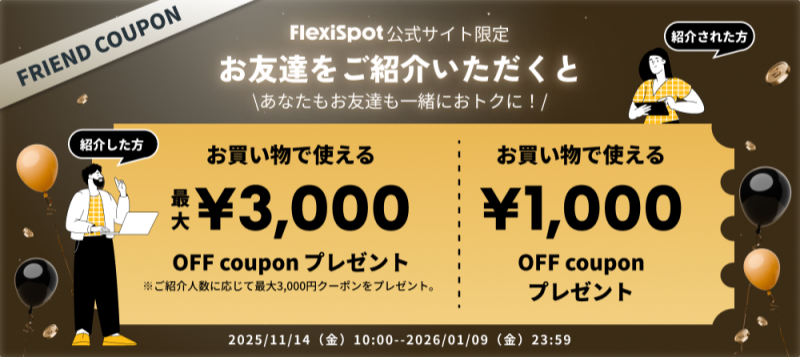 FlexiSpotの公式サイト会員になっていない友達に紹介コードを送ると、紹介した人もされた人も割引クーポンをゲットできます。紹介した方は最大3,000円分のクーポンを受け取れます。ぜひお友達に紹介コードをお送りください!詳細については、このページをご覧下さい。