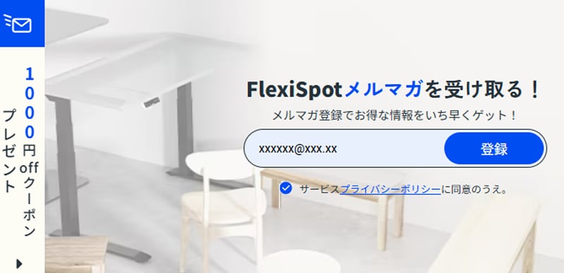 まだFlexiSpotのメールマガジンに登録していない方は、登録するだけで1,000円OFFクーポンがもらえるチャンス!最新セール情報やキャンペーンのお知らせも受け取れるため、一石二鳥です。