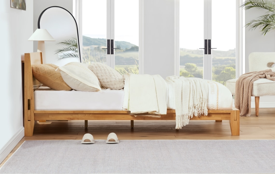 ここまで、木組みベッドの構造的な特徴や価値について解説してきました。最後に、その思想を現代の暮らしに落とし込んだ製品の一例として、FlexiSpotの木組みベッドKana Bedをご紹介します。伝統的なほぞ組みの考え方をベースにしながら、現代の住環境やライフスタイルに合わせて再設計された木組みベッドです。