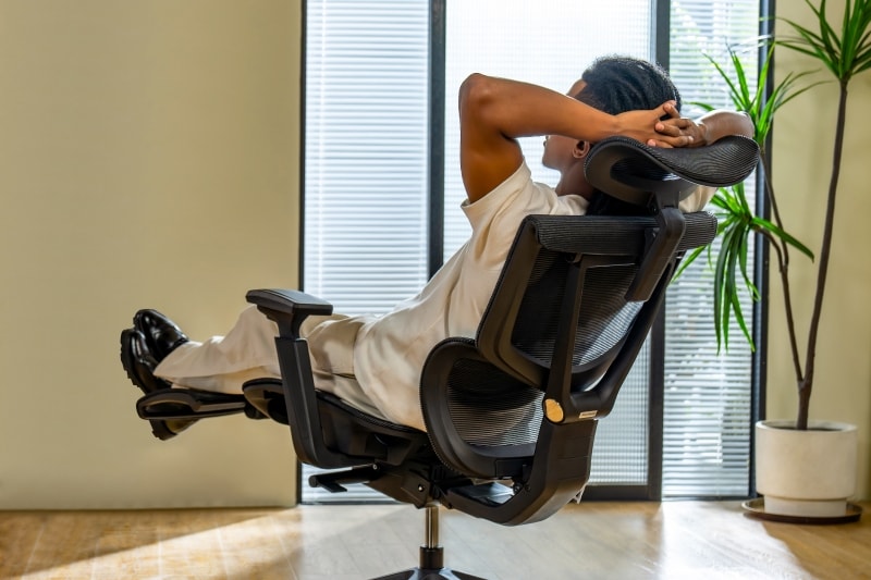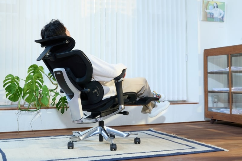 多くのオットマン付きオフィスチェアは、背もたれのリクライニング機能と連動しています。仕事の合間に背もたれを倒し、足を伸ばせば、仮眠や読書、動画鑑賞にもぴったり。また、リクライニング角度が135度以上あるモデルなら、体重を分散して腰や背中への負担を軽減できます。長時間座ることで起こる腰痛対策にも効果的です。「オフィスでも快適に休憩を取りたい」「作業の合間に軽く横になりたい」という方にとって、オットマン付き椅子はまさに理想的な選択です。