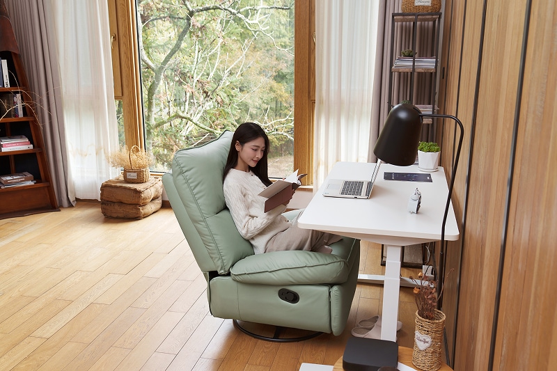 日中のひと休みや休日の午後、読書をしたり、音楽を聴いたりする時間にも最適。座面を軽く回転させて窓の外に向けると、自然光の中で読書が楽しめます。また、リクライニングを深めに倒してフットレストを上げれば、まるで包み込まれるようなリラックス感。お気に入りのクッションやブランケットを合わせると、さらに居心地がアップします。
