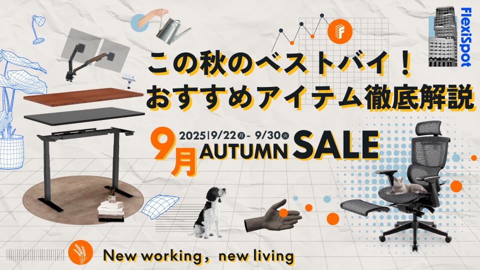 FlexiSpotでは、この秋に合わせて人気商品をお得に手に入れられる「AUTUMN SALE」を開催。電動昇降デスクやエルゴノミクスチェア、リクライニングソファや電動ベッドまで、多彩なラインナップが特別価格になっています。本記事では、用途やライフスタイルに合わせておすすめのアイテムを徹底解説し、この秋に「何を買えばいい?」という疑問にお答えします。