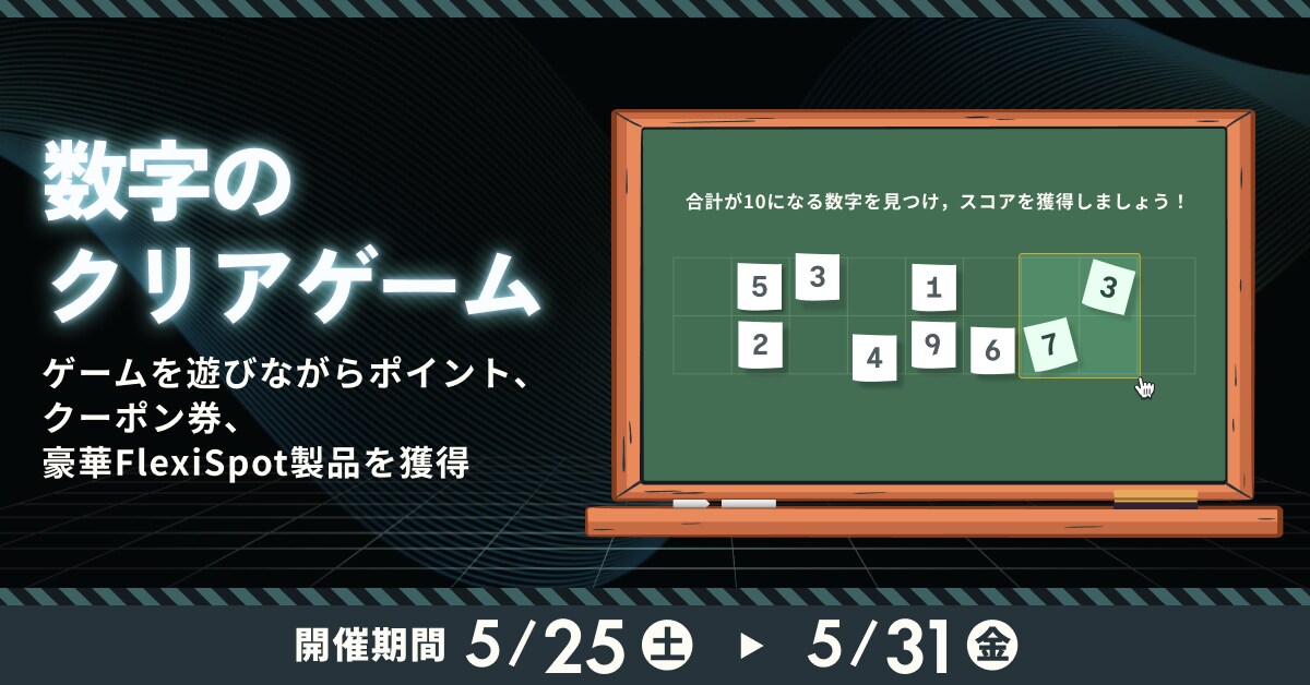 数字のクリアゲームを遊んで、FlexiSpot会員ポイント、クーポン券、豪華FlexiSpot製品を獲得できます。
