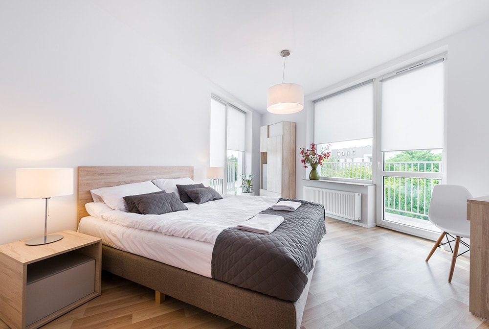 机を壁や窓に面する位置に置きます。こうすることでふわふわのマットレスと柔らかい枕が置かれた魅力的なベッドの眺めに気を取られることはありません。