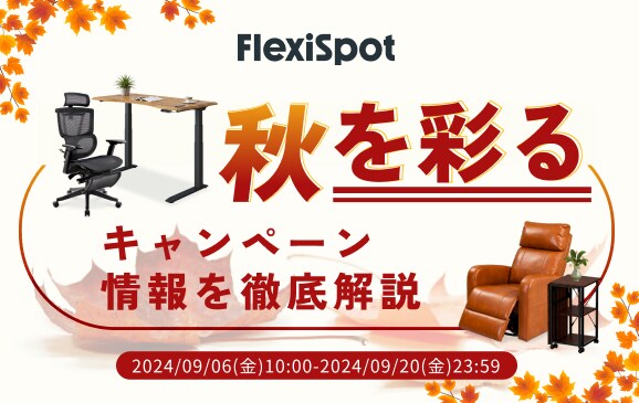 酷暑の夏も過ぎ、処暑とはなりましたが、まだまだ厳しい暑さは和らぎそうにありません。これから秋が本番に近づくにつれ、空は高く澄み、木々は鮮やかな色に染まり、この多彩な季節は、私たちの生活にも豊かな彩りをもたらしてくれます。FlexiSpotはこの美しい季節の始まりに合わせて、人気商品を含めた割引セールを実施いたします。一部商品は複数からカラーをチョイス可能で、皆様の日常生活に秋の様な豊かな彩りを添えてくれることでしょう。それでは、以下キャンペーン情報をご確認ください。